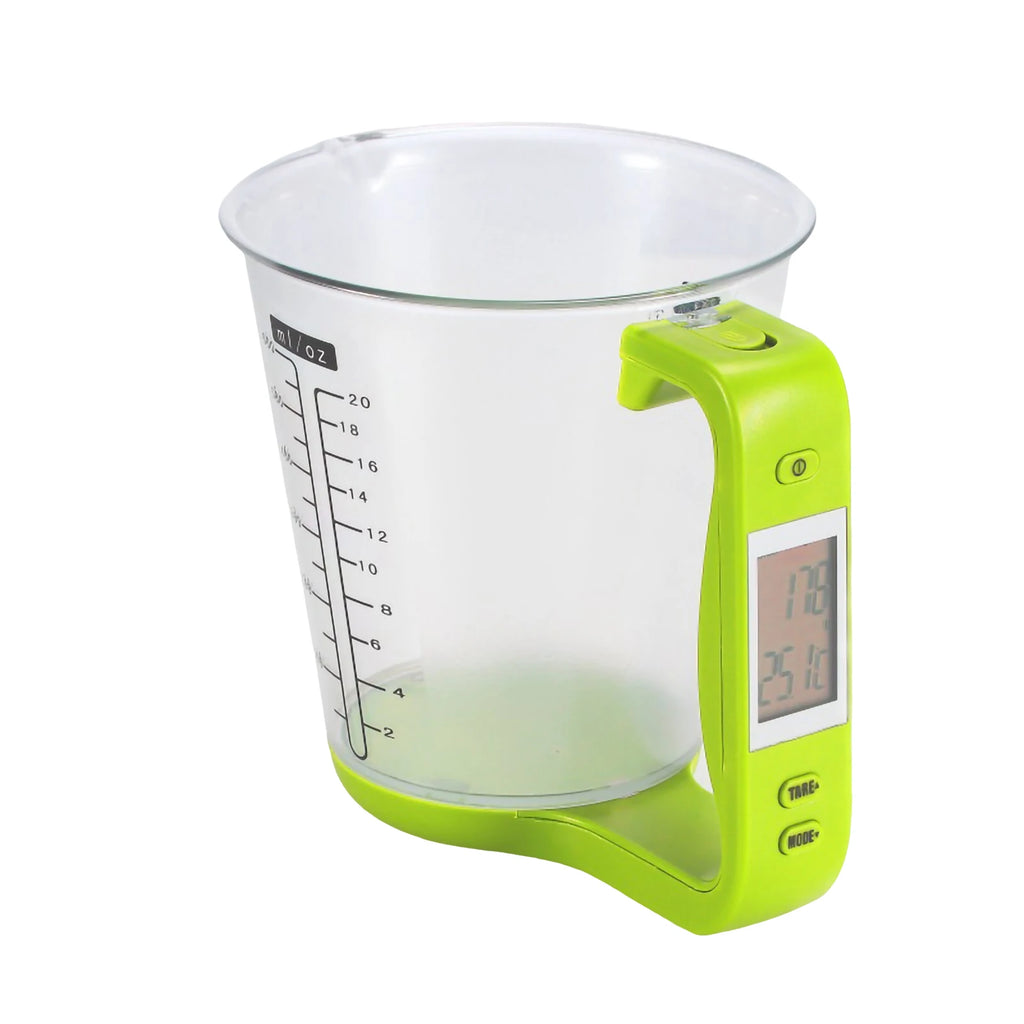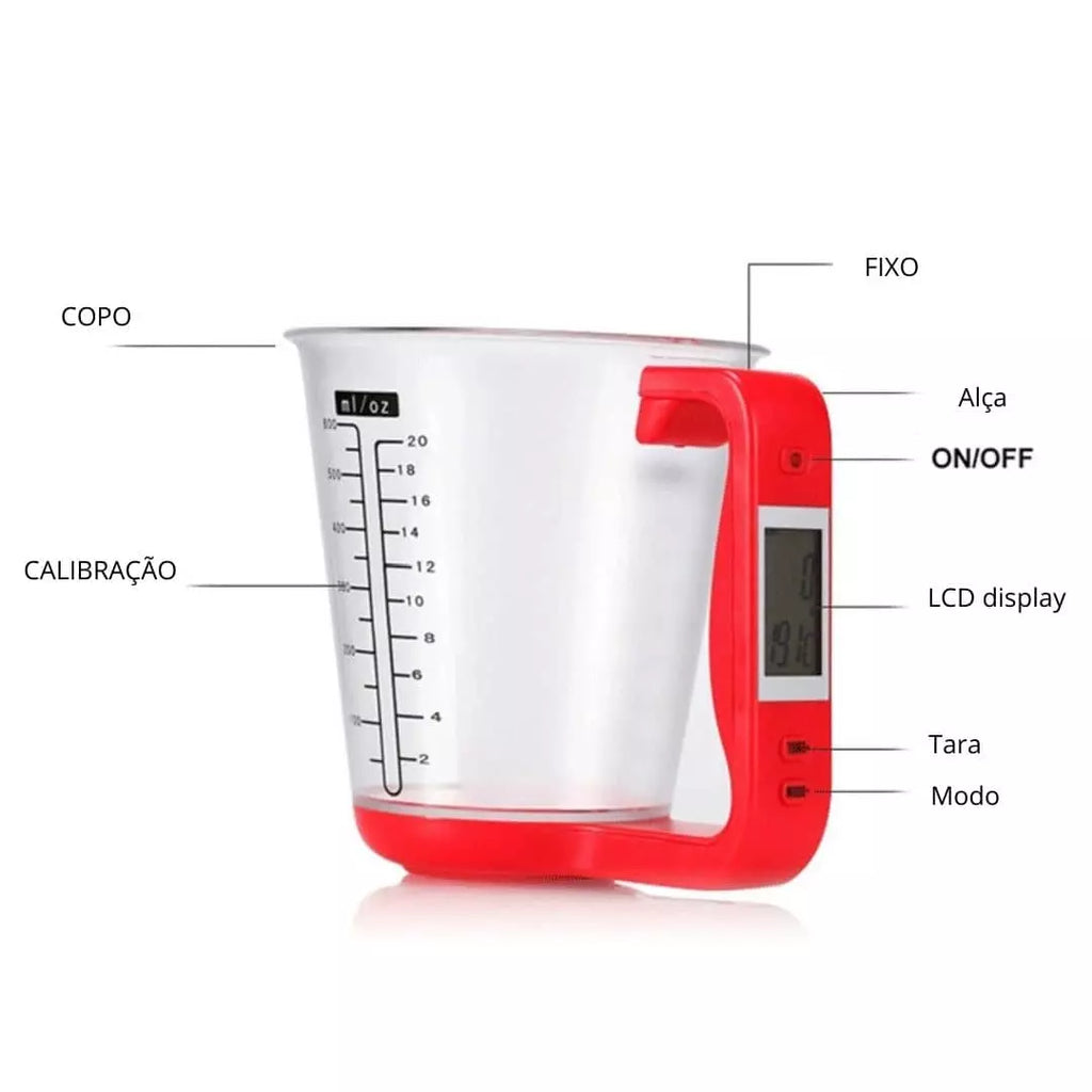 O Copo de Medida Inteligente é fácil de usar. Basta adicionar os ingredientes desejados ao copo, e o display LCD digital mostrará o peso do ingrediente em gramas ou onças, além de exibir a temperatura do líquido.